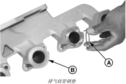 6. 用定位銷(xiāo)安裝帶墊圈(A) 的排氣歧管(B)。(參見(jiàn)第080 章的“拆卸、檢查和安裝排氣歧管”部分。)