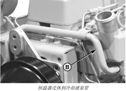5. 安裝恒溫器殼體到冷卻液泵管 (B)。