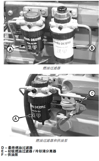 注意: 燃油過(guò)濾器(A) 和(B)、輸油泵(C) 的位置隨John Deere約翰迪爾強鹿柴油發(fā)動(dòng)機和噴油泵型號的不同而有所改變。關(guān)于按要求拆卸過(guò)濾器和/ 或供油泵的步驟,請參見(jiàn) CTM217(機械燃油系統)、CTM179 (配有 Bosch VP44泵的 4 級電子燃油系統)CTM341 (配有Stanadyne DE10 泵的 12 級電子燃油系統)或CTM284 (只有英文版)(配有 Delphi/LucasDP201 泵的 1 級電子燃油系統)的第 02 部分第090 章。