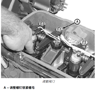 如果需要調整閥門(mén),松開(kāi)搖臂調節螺釘上的鎖緊螺母(A)。轉動(dòng)調整螺釘直到塞尺的滑動(dòng)略有阻力為止。用螺絲刀固定調整螺釘防止其轉動(dòng),同時(shí)按技術(shù)規格要求擰緊鎖緊螺母。擰緊鎖緊螺釘后再次檢查間隙。必要時(shí),再次調整間隙。