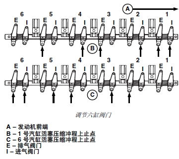 4. 調整 2 號、4 號和 6 號汽缸排氣閥門(mén)間隙和 3 號、5號和 6 號汽缸進(jìn)氣閥門(mén)間隙。