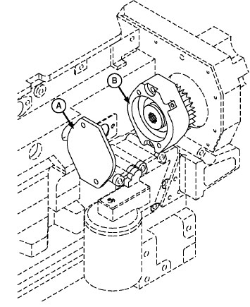 5. 拆下帶帽螺釘 (A) 和凸輪軸起動(dòng)供油泵。參見(jiàn)CTM217 (機械燃油系統)第 02 部分第 090 章“拆卸供油泵”、CTM341(配 Stanadyne DE10 泵的 12級電子燃油系統)第 02 部分第 090 章“拆卸供油泵”或 CTM230 (配 Denso 高壓共軌的 11 級電子燃油系統)第 02 部分第 090 章“拆卸機械輸油泵”。