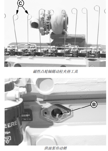 7. 維修臺上的John Deere約翰迪爾強鹿柴油發(fā)動(dòng)機要轉一定角度,使凸輪軸隨動(dòng)柱和供油泵制動(dòng)銷(xiāo) (B) 沿凸輪軸凸輪緣脫離。