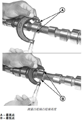 1. 在最高點(diǎn) (A) 和最低點(diǎn) (B) 分別測量每個(gè)凸輪緣。它們尺寸之間的差別就是凸輪軸凸輪緣高度。如果凸輪軸上任一凸輪緣的高度不符合技術(shù)規格的要求,應安