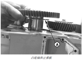 9. 從凸輪軸齒輪背面的槽中拆下止推板 (A)。