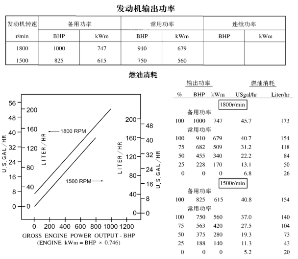 以上所示發(fā)動(dòng)機性能數據,是基于ISO 3046 標準規定的條件—海拔110m(361ft),大氣壓力100kPa (29.53inHg),進(jìn)氣溫度25°C(77°F),相對濕度30%,使用NO.2柴油或相當于A(yíng)STM D2柴油的條件下得到的。 功率標定使用準則見(jiàn)《G-發(fā)動(dòng)機功率標定使用準則》。 油消耗數據是基于重度為0.85kg/l(7.1lbs/U.S.gal.)的NO.2柴油而得到的。 | |