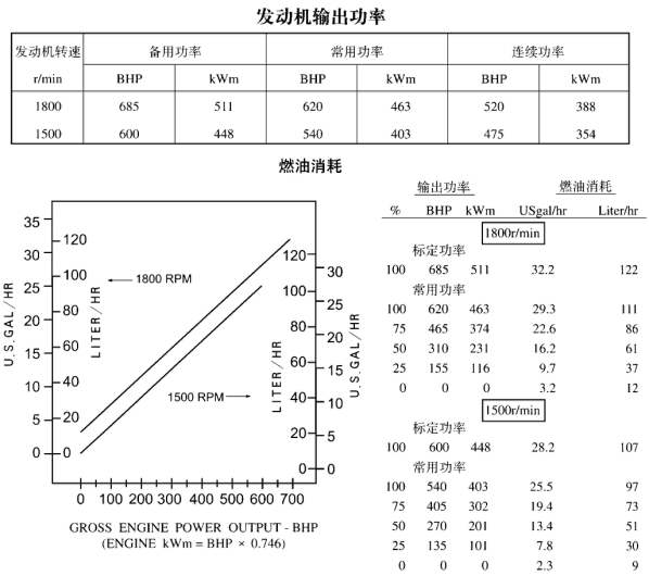 性能數據 備用功率標定 常用功率標定 kW(BHP)@1500r/min(50Hz) 369(495) 336(450) 燃油消耗 L/h(U.S.gal./h) 91(24.0) 83(21.8) 空燃比 24.5 26 排氣流量 L/h(CFM) 1241(2630) 1194(2530) 排氣溫度°C(°F) 529(985) 524(975) 排放數據 單位:均為g/BHP.hr 成分 備用功率標定 常用功率標定 HC N/A N/A NOX N/A N/A CO N/A N/A PM 0.50 0.50 SO2 0.61 0.61 CO2 500 500 N2 2900 3100 O2 370 430 H2O 180 180 試驗條件 試驗過(guò)程中,將發(fā)動(dòng)機穩定控制在標定轉速(±25r/min),標定功率(±2%)范圍內,使得壓力、溫度和排放數據穩定。 燃油規范:硫(重量) 含量0.2%、十六烷值為42 —50的ASTM D975 No.2 柴油 燃油溫度:37℃(99°F) ±5℃(9°F) [燃油泵進(jìn)口] 進(jìn)氣溫度:25℃(77°F) ±5℃(9°F) 大氣壓力:100kPa (29.53inHg) ±3.4kPa (1inHg) 濕 度:NOX測量值按75喱H2O/lb.干空氣進(jìn)行修正 | |