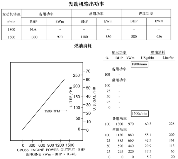 以上所示發(fā)動(dòng)機性能數據,是基于ISO 3046 標準規定的條件—海拔110m(361ft),大氣壓力100kPa (29.53inHg),進(jìn)氣溫度25°C(77°F),相對濕度30%,使用NO.2柴油或相當于A(yíng)STM D2柴油的條件下得到的。 功率標定使用準則見(jiàn)《G-發(fā)動(dòng)機功率標定使用準則》。 油消耗數據是基于重度為0.85kg/l(7.1lbs/U.S.gal.)的NO.2柴油而得到的。 | |