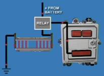 繼電器在電控系統中也被用作輸出設備,用于實(shí)現小電流對大電流的控制,或者一個(gè)電路對多個(gè)電路的控制。典型的如下右圖所示的格柵加熱器控制電路。由于格柵加熱器的工作電流很大,無(wú)法直接在 ECM內通過(guò),ECM通過(guò)控制一個(gè)繼電器來(lái)控制格柵加熱器的工作。ECM對繼電器的控制電流昀大可以達到 2安培。