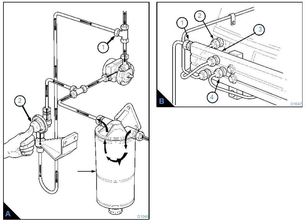 4 松開(kāi)連接 (B2) 和燃油回油連接 (B4)。 操作充油泵 (A2) 直到不含空氣的燃油從接頭流出,然后牢固擰緊