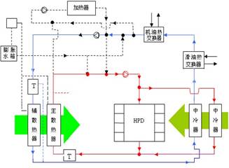 從上面方程可以看出,主散熱器的散熱量大于高溫回路各部件散熱量之和,產(chǎn)生這種現象的原因,考慮是由于水泵的部分功率轉化成熱量,增加了主散熱器散熱負荷。高溫回路水泵功率為2.5kW,加上水泵功率,系統能量正好平衡。