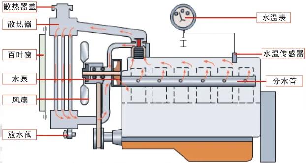 散熱器的進(jìn)水管與缸蓋水套相通,出水管通過(guò)水泵與缸體水套相通。發(fā)動(dòng)機運轉時(shí),水泵將冷卻液在水套與散熱器之間進(jìn)行循環(huán),把發(fā)動(dòng)機水套內高溫的冷卻液抽入散熱器進(jìn)行散熱,再將散熱后的低溫冷卻液送入水套繼續對發(fā)動(dòng)機進(jìn)行冷卻。