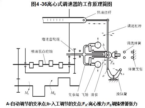柴油機在工作時(shí),通過(guò)曲軸驅動(dòng)裝在噴油泵凸輪軸后端上的飛錘旋轉,飛錘受離心力的作用而向外飛開(kāi)。此離心力產(chǎn)生的推力FA和調速彈簧的張力FB。在某一轉速下相平衡,而使調速器和噴油泵保持在一定的位置下工作。
