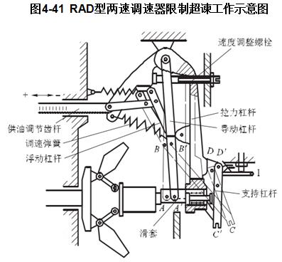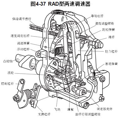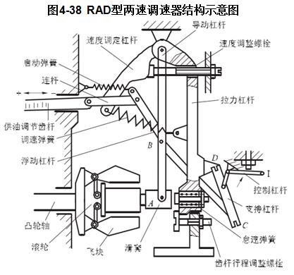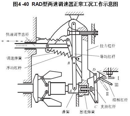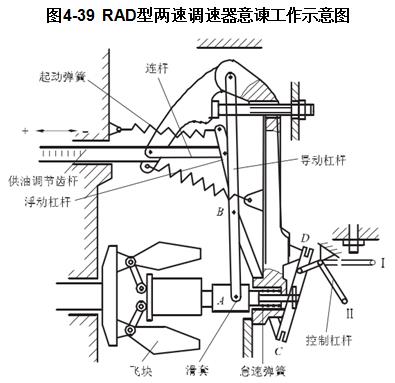 圖4 - 37所示為CA1091 K3型載貨汽車(chē)柴油機所用的RAD型兩速調速器,其調速原理結構示意圖如圖4-38所示。