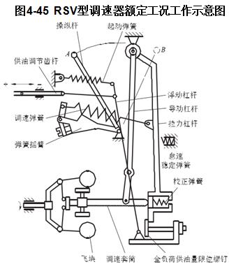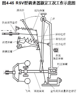③額定工況。如圖4-45所示,當駕駛員將加速踏板踩到底,使操縱處于極限位置A時(shí),調速彈簧達到最大拉伸狀態(tài),此時(shí)拉力最大。張緊的調速彈簧將拉力杠桿拉靠在全負荷供油量限位螺釘上,并通過(guò)調速套筒、導動(dòng)杠桿和浮動(dòng)杠桿將供油調節齒桿推至全負荷供油位置,亦即柴油機在額定工況下工作。此時(shí),飛塊的離心力與調速彈簧的作用力平衡。