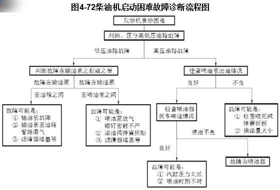 在進(jìn)行“發(fā)動(dòng)機啟動(dòng)困難”故障排除時(shí),按照“檢查沃爾沃發(fā)動(dòng)機噴油是否正?!獧z查噴油是否正時(shí)—檢查汽缸壓縮壓力是否太低”的順序進(jìn)行。診斷流程如圖4-72所示。