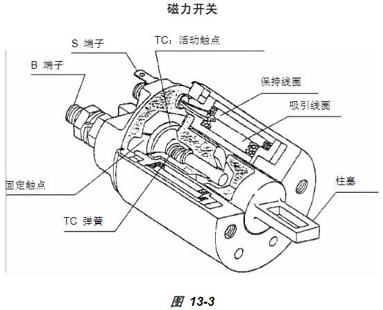 圖 13-3所示為磁力起動(dòng)馬達電磁閥。磁力開(kāi)關(guān)有下列主要功用:•吸引柱塞來(lái)推出小齒輪,使其與洋馬發(fā)動(dòng)機齒圈嚙合。•閉合活動(dòng)觸點(diǎn),使蓄電池電流流過(guò)電樞。