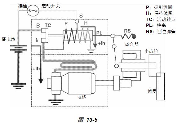 小齒輪的移動(dòng)圖 13-4所示為洋馬柴油機起動(dòng)馬達電路中小齒輪和活塞觸點(diǎn)的移動(dòng)以及電流的流動(dòng)。