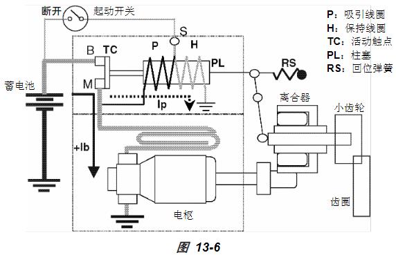 此時(shí),S 端子上的蓄電池電壓 Vb消失。另一方面,蓄電池電壓 Vb會(huì )施加到觸點(diǎn) M 上。因此,電流從觸點(diǎn) M 經(jīng)吸引線(xiàn)圈 P 流到保持線(xiàn)圈 H,最終流向接地。在(圖 13-6)所示的狀態(tài)下,