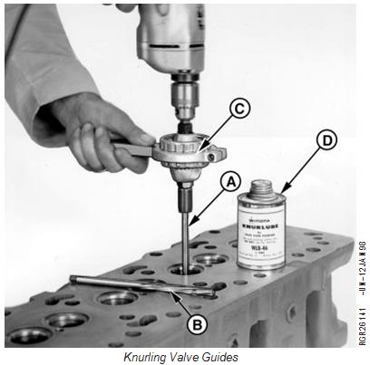注意:磨損的導軌允許間隙為0.15毫米(0.006英寸),但仍可接受。如果氣門(mén)與導軌之間的間隙為0.25 mm0.010 in.)或更小,磨損的導軌可以滾花,以使其返回到規定的間隙。如果間隙超過(guò)0.25 mm0.010 in.),則安裝超大閥門(mén)。