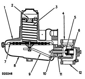 1)彈簧側室(2)調節螺絲(3)彈簧(4)出口(5)閥盤(pán)(6)主噴嘴(7)主通風(fēng)口(8)控制桿側室(9)控制桿(10)鎖銷(xiāo)(11)閥桿(12)進(jìn)氣口