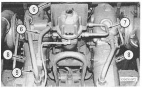 5)排氣肘管(6)排氣肘管和排氣集管間的水管(7)排氣旁通閥導承和排氣肘管間的水管(8)水冷卻排氣集管(9)排氣集管和渦輪增壓器渦輪機殼體間的水管
