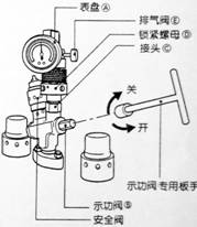 ①如(圖2)所示安裝爆壓表A前,用示功閥專(zhuān)用扳手打開(kāi)示功閥B,然后,輕松開(kāi)啟1-2次后關(guān)閉示功閥(目的是為了吹掉內部污物以免造成爆壓表?yè)p壞)