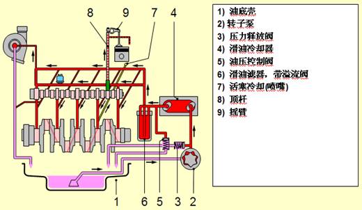 壓力潤滑  對負荷大,相對運動(dòng)速度高的摩擦面,例如:主軸承、連桿軸承、凸輪軸軸承和氣門(mén)搖臂軸(因位置偏高)等都利用機油泵采用潤滑強度較大的壓力潤滑。