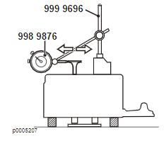 4 放上9989876 千分表和 9999696 磁力架,使千分表尖端與閥盤(pán)邊緣接觸。將閥移到旁邊,朝向排氣導管或進(jìn)氣導管。讀取千分表上的值。