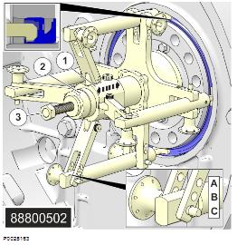 1 調整臂 88800501 安裝工具 并安裝工具。設定直徑:使用 A. Ø 151 前密封件 D13。1 前進(jìn):掛鉤松開(kāi)向后:掛鉤扣緊2 張緊螺母3 緩慢拉出密封件。安裝重要事項!密封環(huán)的金屬側必須向內。