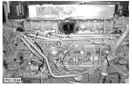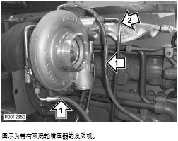 23 僅適用于 D13B-A/C/G/H/K/L,D13C2-A,D13C4-A(雙渦輪增壓器)檢查 Y 形管上的渦輪密封表面并安裝一個(gè)新襯墊。安裝后渦輪增壓器。注意 特殊扭矩,請參見(jiàn)安裝須知。將水軟管安裝到渦輪增壓器上。將回油管(1)連接到渦輪增壓器上。注意 在安裝在飛輪殼上的密封環(huán)上涂抹 VP 潤滑油(零件號 1698135-8)以方便油管安裝。將油管(2)連接到渦輪增壓器上并將其夾緊至吊耳上。