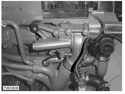 9 提起閥殼體和渦輪并將其與螺柱對準。安裝墊圈和新螺母。D13B-A/H 和舷內發(fā)動(dòng)機 D13B-C/L,D13C4-A按照功能組 25:進(jìn)氣與排氣系統 24 頁(yè)扭轉歧管和渦輪增壓器。D13B-G/K,D13C2-A 和 IPS 發(fā)動(dòng)機 D13B-C/L,D13C4-A對著(zhù)歧管扭轉閥殼體。D13B-B/D/E/F/J/M/N,D13C1-A,D13C3-A(單渦輪)對著(zhù)歧管扭轉渦輪。所有發(fā)動(dòng)機安裝連接到歧管前端缸蓋上的螺柱接頭。安裝歧管和水泵之間的兩個(gè)水連接。使用新密封件并用Forminol潤滑。安裝冷卻劑溫度傳感器。圖示為帶有旁通閥的渦輪增壓器(D13B-A/C/G/H/K/L,D13C2-A,D13C4-A,雙渦輪增壓器)。
