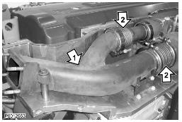 27 僅適用于 D13B-A/C/G/H/K/L,D13C2-A,D13C4-A(雙渦輪增壓器)安裝空氣過(guò)濾器固定器(1)。將橡膠螺柱軟管(2)夾緊至渦輪增壓器。安裝 CCV 單元管路并固定夾子。