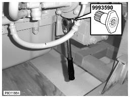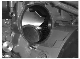 11 將泵提到合適的位置并用曲柄轉動(dòng)發(fā)動(dòng)機9993590 旋轉工具使正時(shí)齒輪與泵上的齒輪嚙合。緊固螺母。拆下工具并安裝保護蓋。