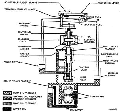 動(dòng)力活塞同傳動(dòng)器的終端(輸出)軸相連,發(fā)動(dòng)機的燃料架聯(lián)動(dòng)裝置也與終端軸相連。當發(fā)動(dòng)機的負載發(fā)生改變時(shí),動(dòng)力活塞的運動(dòng)會(huì )轉動(dòng)終端軸,聯(lián)動(dòng)裝置將使燃料架移動(dòng)到新的設定之上,從而與新負載條件下的發(fā)動(dòng)機速度保持一致。