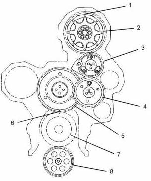 正確噴油正時(shí)和氣門(mén)機構操作的基礎由前齒輪總成正時(shí)的對準決定。正時(shí)標記(1)到正時(shí)標記(6)對齊,以便在活塞移動(dòng)和氣門(mén)移動(dòng)之間提供正確的關(guān)系。