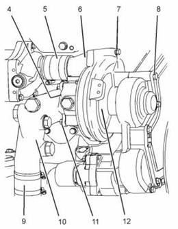 3. 將卡特C13珀金斯2206柴油機水泵(12)定位到發(fā)動(dòng)機上并安裝螺栓(8)。將螺栓擰緊至55 N•m(41 lb ft)的扭矩。