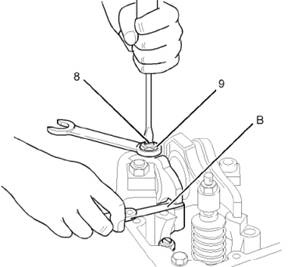 a松開(kāi)進(jìn)氣門(mén)搖臂上的鎖緊螺母(9)。