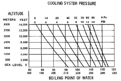 沸點(diǎn)受三種因素影響:壓力,海拔和冷卻液中的乙二醇濃度。液體沸點(diǎn)隨著(zhù)壓力增加而增加。液體沸點(diǎn)隨著(zhù)海拔高度增加而降低。圖39顯示壓力和海拔對水的沸點(diǎn)的影響。