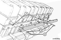 用 lubriplate 將 O 形密封圈 (1) 固定在歧管上的沉孔中。將 O 形密封圈安裝在機油歧管上。每個(gè)搖臂室需要一個(gè)密封圈。
