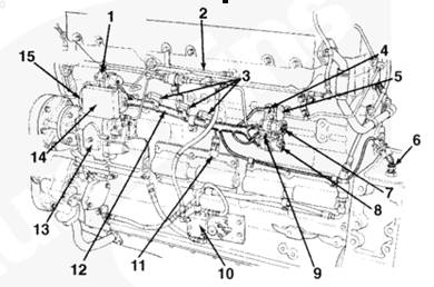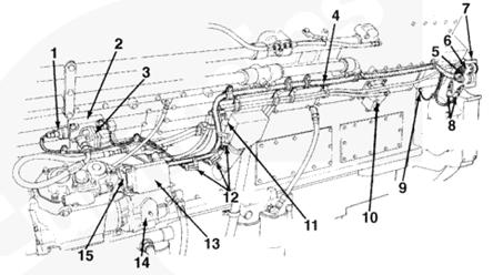 1油軌壓力傳感器,2燃油連接塊,3燃料切斷閥4發(fā)動(dòng)機線(xiàn)束,5 C6 接頭,6 C5 接頭,7 OEM C5 和 C6 接頭支架,8發(fā)動(dòng)機轉速傳感器,9系統接地接頭,10液壓機械式 STC 執行器,11發(fā)動(dòng)機側數據通信接頭,12保險絲 (5A),13 ECM,14燃油泵,15電子燃油控制閥。