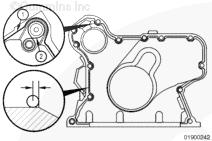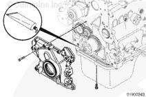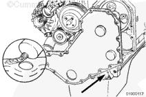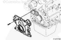 注: 安裝三個(gè)導向銷(xiāo)(零件號 3164977)以改進(jìn)前蓋和前油封與齒輪室和曲軸的對準情況。