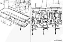 拆下油底殼。參考步驟 007-025。拆下活塞冷卻噴嘴。參考步驟 001-046。