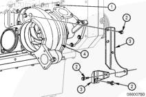 從康明斯發(fā)動(dòng)機缸體 (1) 和水泵支架 (3) 上拆下 2 個(gè)螺釘 (2)。從水泵 (4) 和水泵支架 (3) 上拆下 2 個(gè)螺釘 (2)。從水泵 (4) 和發(fā)動(dòng)機缸體 (1) 上拆下螺釘 (2) 和水泵支架 (3)。
