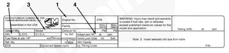 發(fā)動(dòng)機銘牌顯示有關(guān)發(fā)動(dòng)機的重要信息。發(fā)動(dòng)機生產(chǎn)序號 (ESN) 和控制零件目錄 (CPL) 提供了訂購零件和服務(wù)所需信息。未經(jīng)康明斯公司批準不得擅自變更發(fā)動(dòng)機銘牌。