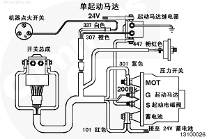只有 L10/M11/N14/K19/QSK19/QST30/V28 發(fā)動(dòng)機需要一個(gè)起動(dòng)馬達。參考單起動(dòng)馬達電氣接線(xiàn)圖。