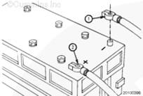 蓄電池可能會(huì )有易爆性氣體逸出。為了盡可能避免人身傷害,在維護蓄電池前,必須保持發(fā)動(dòng)機艙通風(fēng)良好。為避免產(chǎn)生電弧,應最先拆下并最后連接蓄電池負極 (-) 電纜。