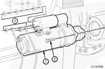 L10/M11/N14 整體式 PRELUB™ 起動(dòng)馬達,拆卸起動(dòng)馬達 (1) 的電氣接頭 (3), 并標識它們的位置。拆下 3 顆螺栓 (2) 和現有的起動(dòng)馬達 (1)。保留螺栓。