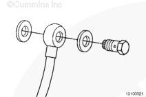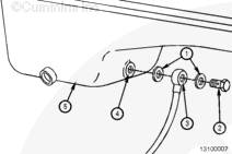 把一個(gè)銅密封墊圈 (1) 放在空心螺栓上 (2)。把空心螺栓插到空心管接頭內 (3)。將其他銅密封墊圈 (1) 放到空心螺栓/空心管接頭總成中。將空心螺栓/空心管接頭總成插入到油底殼 (5) 的回油側 (4)。扭矩值:  88  n.m  [65 ft-lb]