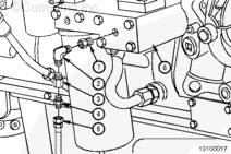 將直螺紋適配器 (1) 裝入機油濾清器座 (6) 中,其中螺塞已拆下。將 90 度彎頭 (2) 裝入適配器。將單向閥 (3) 裝入彎頭。單向閥上的箭頭必須指向彎頭,并且與油流方向一致。將陽(yáng)性軟管適配器 (4) 裝入單向閥。將預潤滑軟管 (5) 連接到陽(yáng)性軟管適配器。